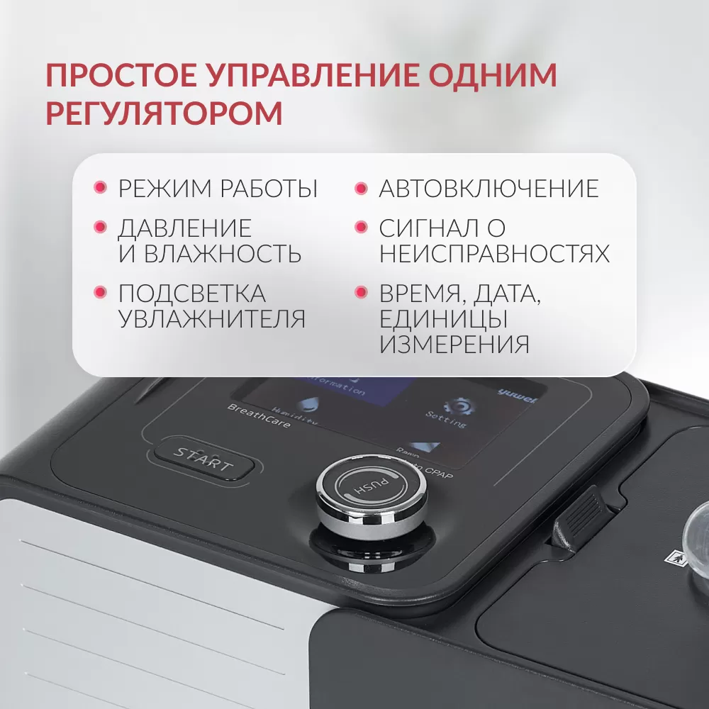 - Понятное управление. На дисплей прибора выводятся все данные о терапии: индекс AHI (соотношение числа случаев апноэ и гипопноэ ко времени сна), длительность предыдущей и текущей терапии, среднее давление и скорость потока во время последнего сеанса и др. Пользователь может задать режим работы, уровень давления и влажности воздуха, включить или выключить подсветку увлажнителя, функцию автовключения и звуковую сигнализацию о неисправностях, настроить время, дату и единицы измерения давления (H2O/гПа). Всё управление осуществляется с помощью одного регулятора.