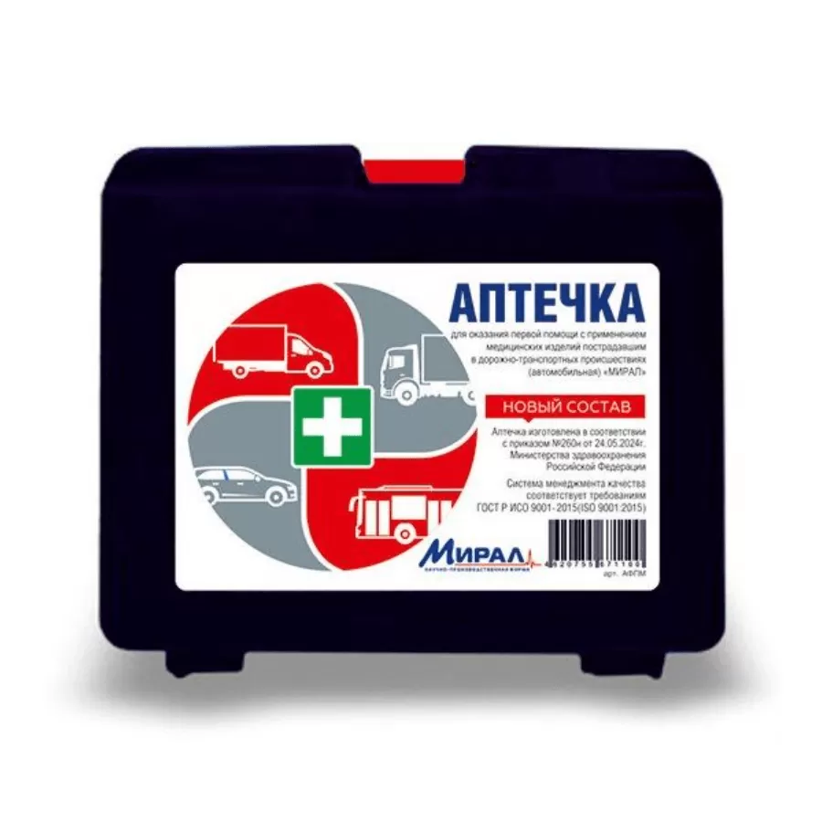 Аптечка Мирал автомобильная по Приказу № 260н от 24.05.2024г., пластиковый футляр.