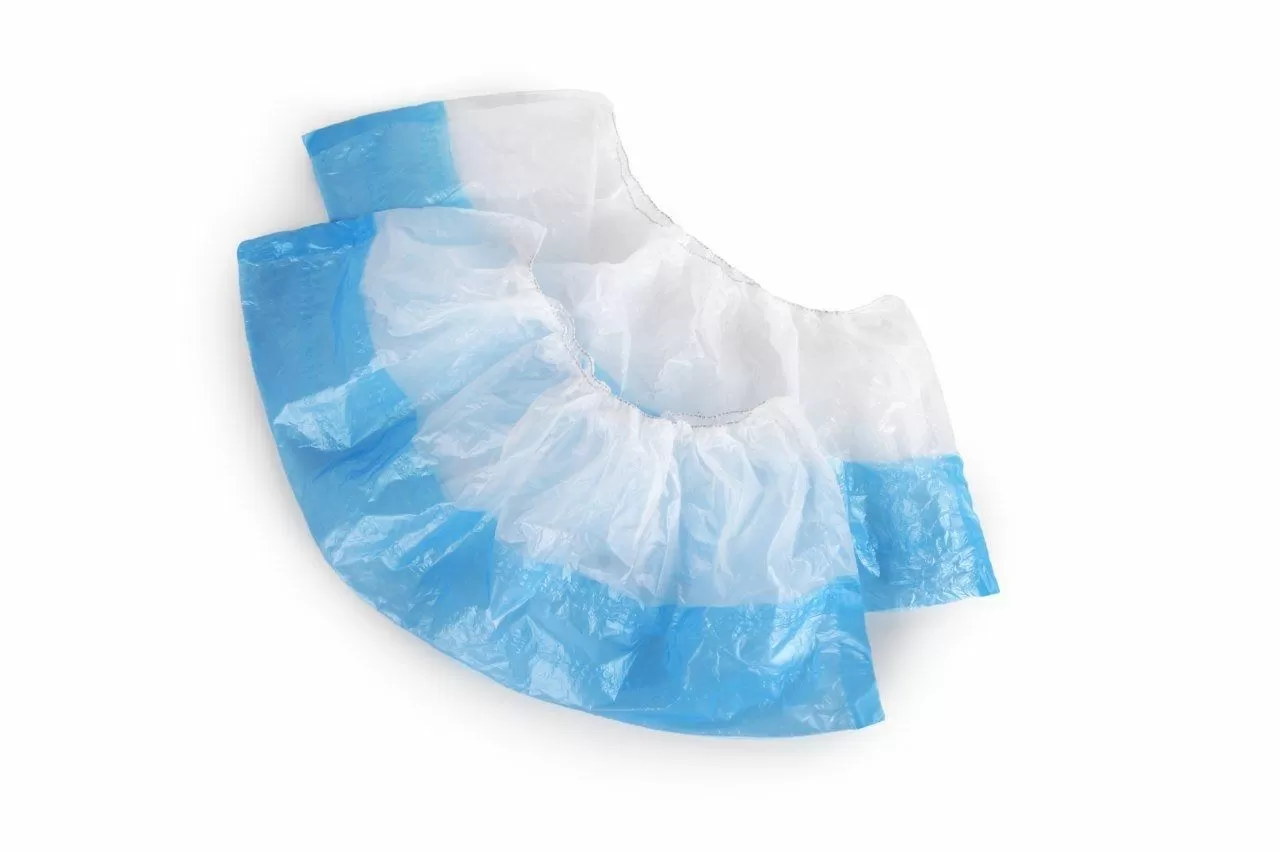 Бахилы EleGreen двойные Super 65 бело-голубые с двойной резинкой. Надежно фиксируются на обуви, не пропускают грязь и влагу, надежно защищают стерильное помещение от бактерий.