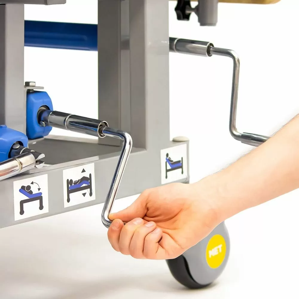 - Самоориентирующиеся колеса с тормозами. Самоориентирующиеся колёса с тормозом на каждом колесе упрощают перемещение кровати в ограниченном пространстве. С помощью этой функции можно быстро и без труда транспортировать пациента в нужное место. Тормоза на колёсах позволяют зафиксировать кровать в определённом положении.