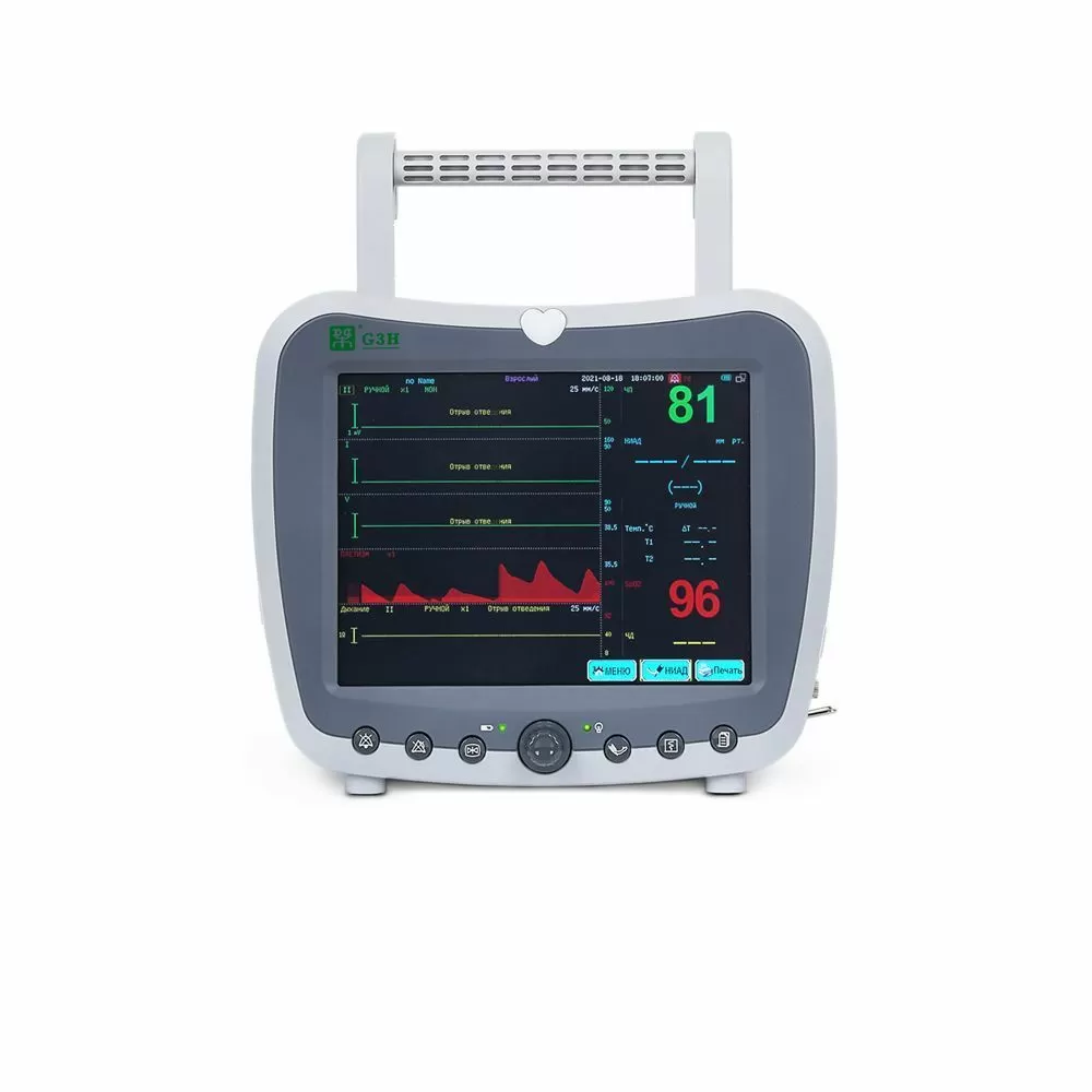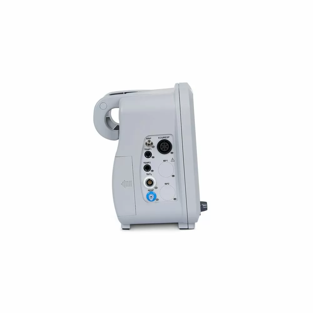 - Монитор измеряет и выводит показатели ЭКГ, ЧСС, NIBP, SpO2, частоты пульса, RESP – респирация (частота дыхания (RR) и дыхание (импеданс или носовая трубка) в виде графика), TEMP – температура.