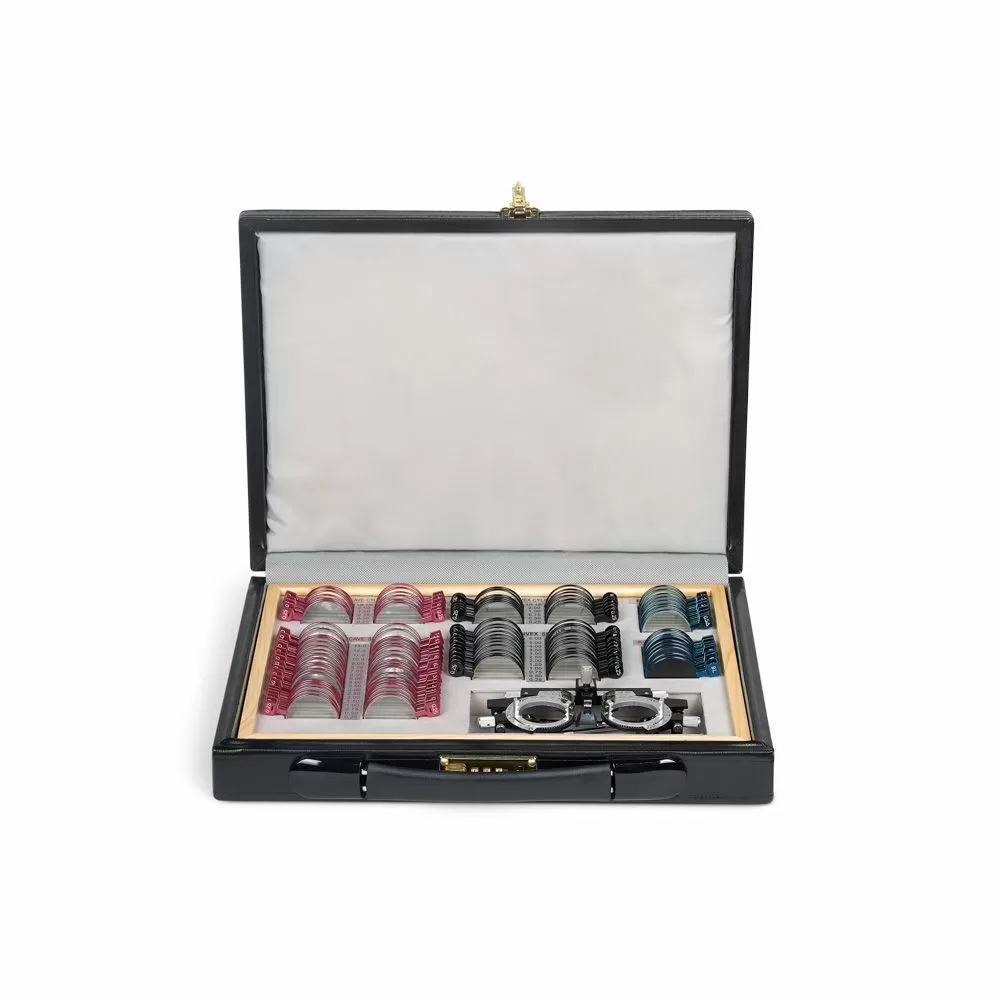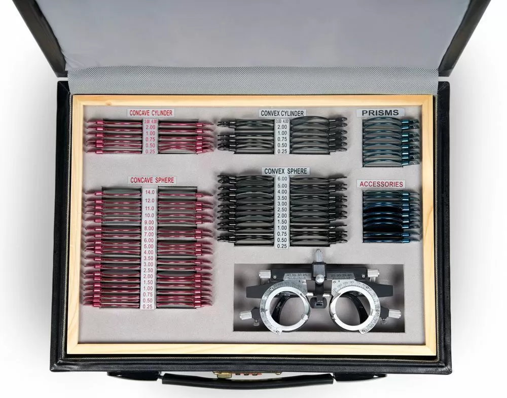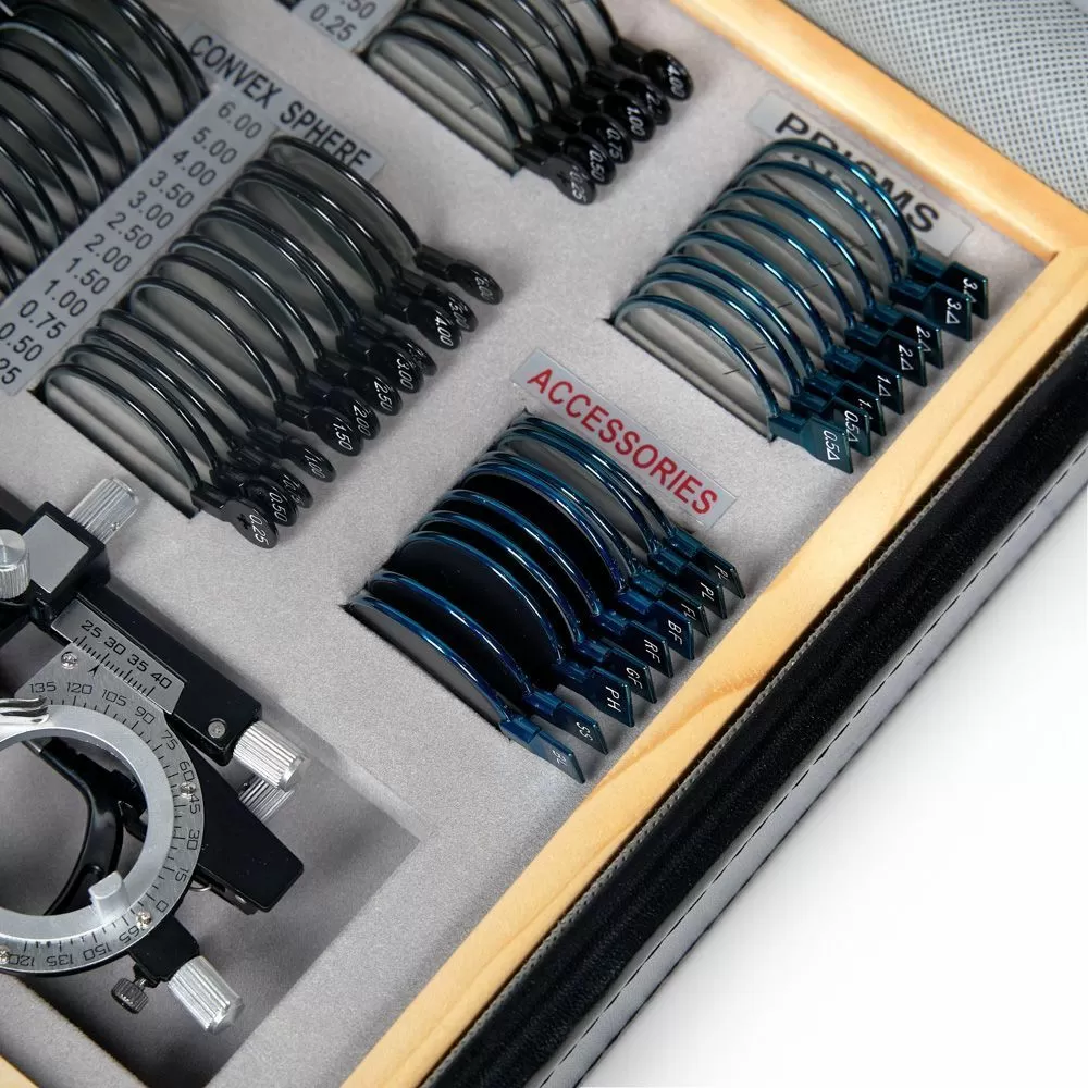 - Для проверки косоглазия и скрытого косоглазия, а также для тренировки структур глаз в наборе представлены призматические линзы. В набор входят парные очковые призмы от 0.5 пр дптр до 3.00 пр дптр