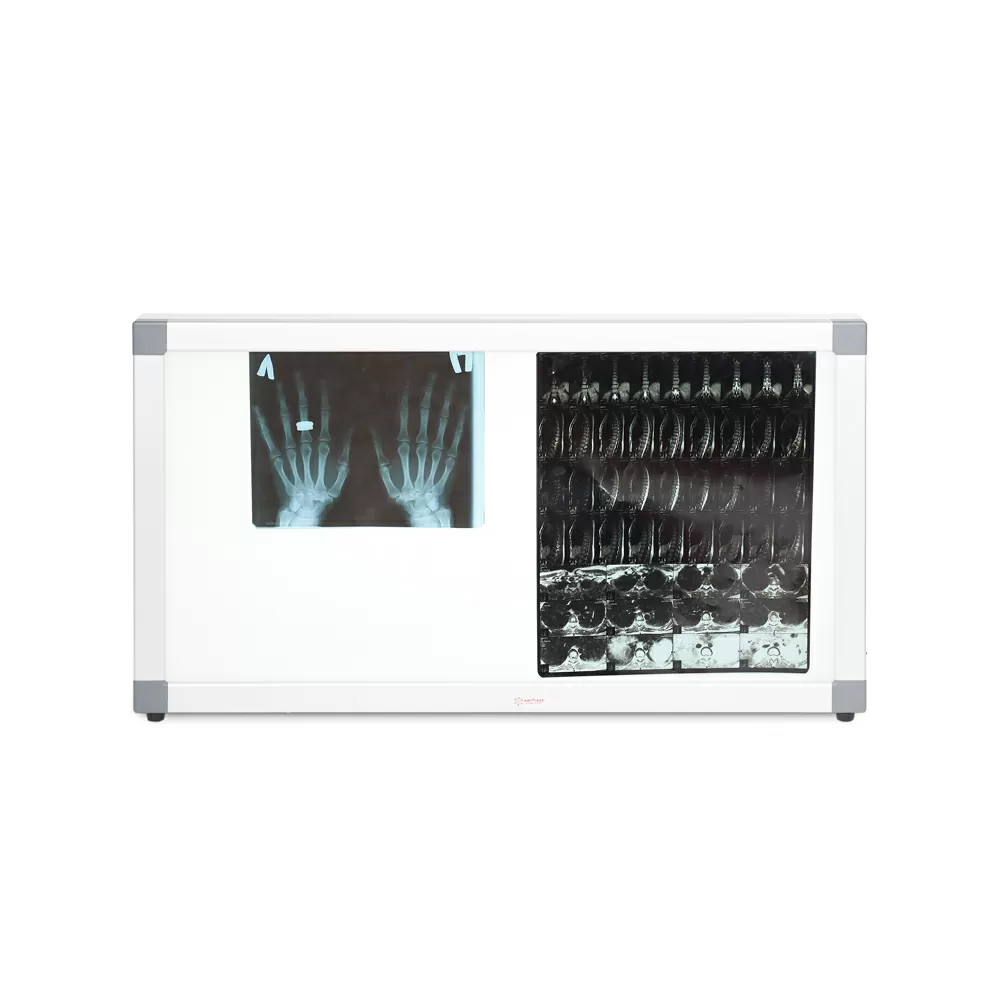 Негатоскоп общего назначения двухкадровый можно повесить на стену или установить на стол – на задней крышке есть отверстия для крепежей, а на корпусе имеются удобные ножки. Восемь светодиодных линеек внутри устройства обеспечивают высокую яркость свечения, равномерное распределение света, а матовое стекло исключает блики. Прибор включается всего одной кнопкой. Рентгеновские снимки устанавливают в специальные пазы: надежная фиксация обеспечивает удобный просмотр.