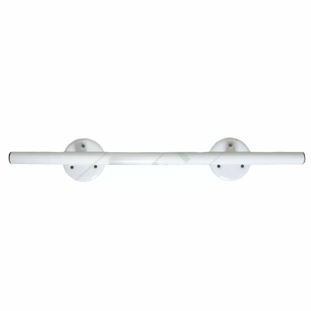 Поручни служат для удобства передвижения по дому, а так же в туалете и ванной. Диаметр фланцев 85 мм, с тремя крепежными отверстиями под шурупы диаметром 4 мм в каждом из них. Размер от края трубы до центра крепёжного элемента 100 мм.