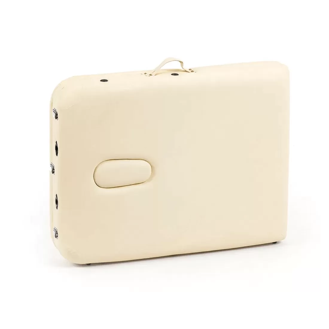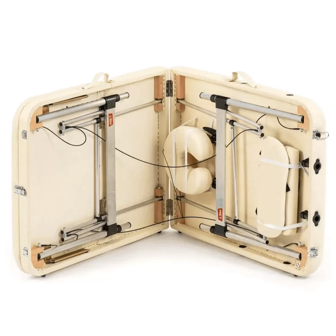 Массажный стол обладает лёгким и прочным алюминиевым каркасом с телескопической регулировкой высоты ножных опор, позволяющими устанавливать стол на удобной для пациента и врача высоте. Виниловое покрытие ложа с ППУ-наполнением выполнено из винилискожи кремового цвета.