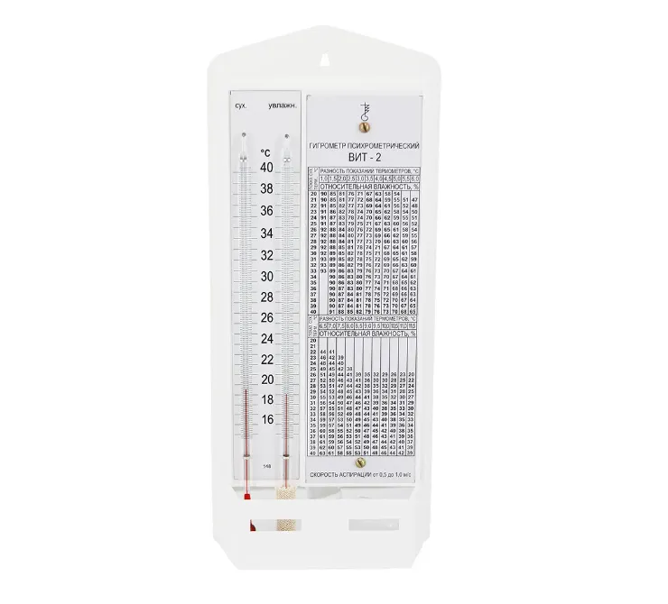 Состоят из пластмассового основания, на котором закреплены температурная шкала с двумя капиллярами, резервуар одного из которых увлажняется фитилем из ткани, опущенным в питатель с водой, и таблица для определения относительной влажности воздуха по разнице показаний «сухого» и «увлажненного». Питатель закреплен с внутренней стороны основания. Шкальная пластина и таблица – металлические.