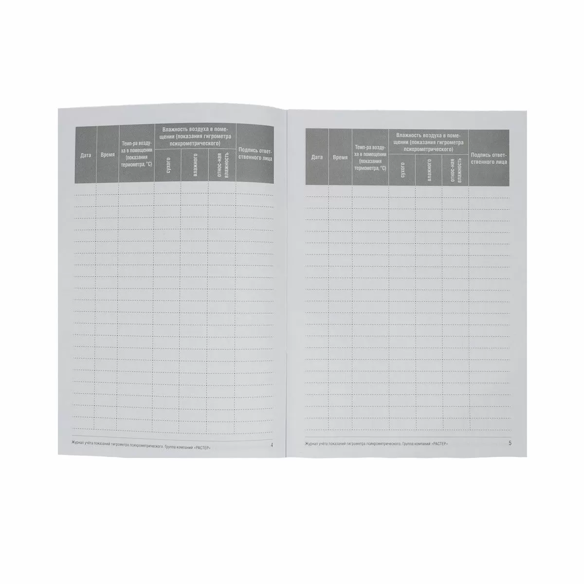 Журнал учета показаний гигрометра психрометрического (ГК РАСТЕР) содержит 8 листов (16 страниц), формат А5 (книжный), ориентация таблицы вертикальная, включает пункты: